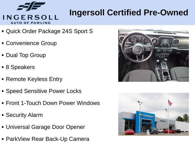 8 Speakers, Automatic Headlamps, Black 3-Piece Hard Top, Convenience Group, Deep Tint Sunscreen Windows, Dual Top Group, Freedom Panel Storage Bag, Front 1-Touch Down Power Windows, Leather Wrapped Steering Wheel, MOPAR All-Weather Floor Mats, ParkView Rear Back-Up Camera, Power Heated Mirrors, Premium Black Sunrider Soft Top w/Dual Top Group, Quick Order Package 24S Sport S, Remote Keyless Entry, Security Alarm, Speed Sensitive Power Locks, Sun Visors w/Illuminated Vanity Mirrors, Universal Garage Door Opener, Wheels: 17 x 7.5 Tech Silver Aluminum.