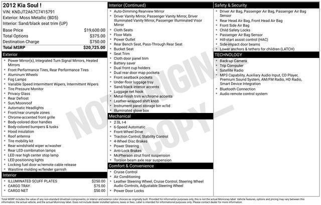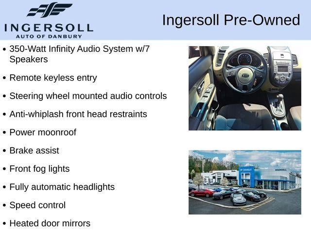 Discover the perfect blend of style, comfort, and capability in this 2012 Kia Soul Exclaim. With its striking green exterior and well-appointed interior, this versatile compact SUV is ready to elevate your driving experience.- Cargo Net- Cargo Tray- Illuminated Scuff PlatesUnder the hood, the 2.0L I4 MPI engine delivers a responsive and efficient performance, achieving an impressive 23 MPG in the city and 28 MPG on the highway. Paired with a smooth-shifting 6-speed automatic transmission, this Kia Soul provides a confident and engaging driving dynamics.Step inside and be welcomed by the premium audio system, featuring 8 speakers and the UVO voice-activated infotainment system. Enjoy the convenience of steering wheel-mounted audio controls, speed control, and the auto-dimming rearview mirror. Stay comfortable with the air conditioning, power windows, and remote keyless entry.For your safety, the Kia Soul Exclaim is equipped with a suite of advanced features, including electronic stability control, traction control, and a comprehensive airbag system. The four-wheel disc brakes with ABS provide reliable stopping power, while the front wheel independent suspension ensures a smooth and composed ride.Elevate your driving experience with the available power moonroof, adding an open-air feeling and letting in natural light. The 18-inch alloy wheels and body-color bumpers contribute to the Soul's sleek and modern appearance, turning heads wherever you go.Whether you're navigating the city streets or embarking on a weekend adventure, this 2012 Kia Soul Exclaim is the perfect companion. Experience the perfect blend of style, technology, and capability – visit us today and discover the joy of driving this exceptional compact SUV.This vehicle is being sold as-is. Ingersoll Automotive will provide the vehicle inspection and reconditioning form, along with a vehicle Carfax History report. Ingersoll Automotive is not providing any implied or express coverage for repair or maintenance on this vehicle.Do not hesitate, call us now at 860.945.4755 to speak with our guest friendly product consultants to schedule your test drive.Pre-Owned Vehicle Prices do not include government fees and taxes, any finance charges, $997 dealer documentation fees (Pawling Conveyance Fee capped at $175 per NY Law), any emissions testing fees or other fees. All prices, specifications and availability are subject to change without notice. The features and options listed are provided by a 3rd party organization and may not apply to this specific vehicle. Contact dealer for most current information. Not responsible for typographic errors.