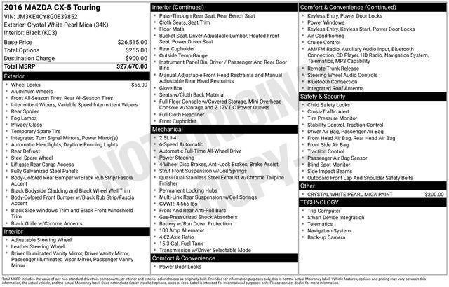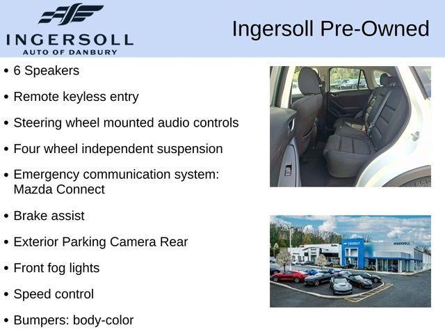 Discover the perfect blend of style, performance, and versatility with this 2016 Mazda CX-5 Touring. This exceptional SUV is the ideal companion for your adventures, offering a dynamic driving experience and an impressive array of features to enhance your daily commute and weekend getaways.Boasting a striking CRYSTAL WHITE PEARL MICA exterior, this CX-5 Touring commands attention on the road. Complementing the sleek design are a range of premium features, including:- CRYSTAL WHITE PEARL MICA PAINT- WHEEL LOCKSStep inside the well-appointed cabin and you'll be greeted by a wealth of thoughtful amenities that cater to your every need. The 6-Speed Automatic SKYACTIV® 2.5L 4-Cylinder DOHC 16V engine delivers a refined and responsive driving experience, while the standard AWD system ensures confident handling in a variety of road conditions.Fuel efficiency is a top priority, with the CX-5 Touring delivering an impressive 24 MPG in the city and 30 MPG on the highway, allowing you to go farther between fill-ups.This Mazda CX-5 Touring is packed with a comprehensive suite of features that elevate your driving experience, including:- 6 Speakers- AM/FM radio- CD player- Radio data system- Radio: AM/FM/CD/HD Modular Audio System w/6 Spkrs- Air Conditioning- Rear window defroster- Power driver seat- Power steering- Power windows- Remote keyless entry- Steering wheel mounted audio controls- Speed control- Electronic Stability Control- Four wheel independent suspension- Speed-sensing steering- Traction control- Front fog lights- Cloth Seat Trim- Leather Shift Knob- Outside temperature display- Overhead console- Tachometer- Telescoping steering wheel- Tilt steering wheel- Trip computer- Navigation System- Exterior Parking Camera RearWith its exceptional combination of style, performance, and features, this 2016 Mazda CX-5 Touring is the perfect choice for the discerning buyer. Experience the difference for yourself by scheduling a test drive at our showroom. We're confident you'll be impressed by the exceptional value and quality this vehicle has to offer.This vehicle is being sold as-is. Ingersoll Automotive will provide the vehicle inspection and reconditioning form, along with a vehicle Carfax History report. Ingersoll Automotive is not providing any implied or express coverage for repair or maintenance on this vehicle.Do not hesitate, call us now at 860.945.4755 to speak with our guest friendly product consultants to schedule your test drive.Pre-Owned Vehicle Prices do not include government fees and taxes, any finance charges, $997 dealer documentation fees (Pawling Conveyance Fee capped at $175 per NY Law), any emissions testing fees or other fees. All prices, specifications and availability are subject to change without notice. The features and options listed are provided by a 3rd party organization and may not apply to this specific vehicle. Contact dealer for most current information. Not responsible for typographic errors.