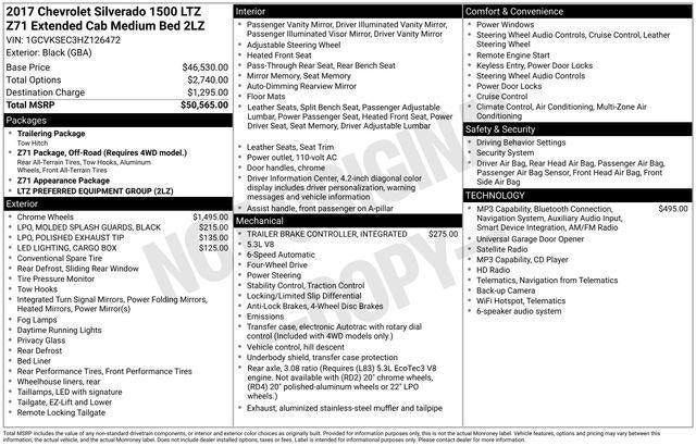 Elevate your driving experience with this stunning 2017 Chevrolet Silverado 1500 LTZ 2LZ. This powerful and versatile truck is the perfect companion for your adventures, whether you're tackling tough terrain or navigating the city streets.Equipped with an impressive array of features, this Silverado is designed to make your life easier and more enjoyable. Some of the standout features include:- Chevrolet MyLink Radio with Navigation and 8 Diagonal Color Touch-Screen- Integrated Trailer Brake Controller- 20 x 9 Chrome Wheels- LED Cargo Box Lighting- Polished Exhaust TipThe Silverado's EcoTec3 5.3L V8 engine and 6-speed automatic transmission deliver exceptional performance and efficiency, with an estimated 16 MPG in the city and 22 MPG on the highway. Its four-wheel-drive capability ensures you can conquer any road, no matter the conditions.Step inside and you'll be greeted by a spacious and well-appointed cabin, featuring premium leather-appointed seating, dual-zone automatic climate control, and a host of advanced technology features. The Chevrolet MyLink infotainment system keeps you connected and entertained, while the integrated trailer brake controller and rear vision camera make towing and maneuvering a breeze.Safety is also a top priority, with features like electronic stability control, traction control, and a comprehensive airbag system to give you and your passengers peace of mind on the road.Whether you're hauling heavy loads, embarking on a road trip, or simply commuting in style, this 2017 Chevrolet Silverado 1500 LTZ 2LZ is the perfect choice. Experience the power, comfort, and convenience that this exceptional truck has to offer. Visit our showroom today and let us demonstrate why this Silverado is the perfect fit for your lifestyle.This vehicle is being sold as Ingersoll Certified Pre-Owned. This program gives you piece of mind. You will receive. **A Vehicle Inspection and Reconditioning Form. **A Vehicle Carfax. **90 Days or 3000 miles of Powertrain Plus Limited Coverage **A Free Maintenance event including oil change and tire rotation within the first 12mo or 12,000 miles of driving (at an Ingersoll Automotive Location) This is not a manufacturer sponsored program.Do not hesitate, call us now at 860.945.4755 to speak with our guest friendly product consultants to schedule your test drive.Pre-Owned Vehicle Prices do not include government fees and taxes, any finance charges, $997 dealer documentation fees (Pawling Conveyance Fee capped at $175 per NY Law), any emissions testing fees or other fees. All prices, specifications and availability are subject to change without notice. The features and options listed are provided by a 3rd party organization and may not apply to this specific vehicle. Contact dealer for most current information. Not responsible for typographic errors.