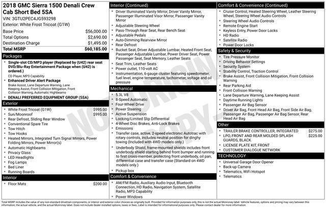 White Frost Tricoat 2018 GMC Sierra 1500 Denali 4D Crew Cab 4WD EcoTec3 5.3L V8 8-Speed Automatic with OverdriveDo not hesitate, call us now at 203.730.5766 to speak with our guest friendly product consultants to schedule your test drive.Pre-Owned Vehicle Prices do not include government fees and taxes, any finance charges, $997 dealer documentation fees (Pawling Conveyance Fee capped at $175 per NY Law), any emissions testing fees or other fees. All prices, specifications and availability are subject to change without notice. The features and options listed are provided by a 3rd party organization and may not apply to this specific vehicle. Contact dealer for most current information. Not responsible for typographic errors.