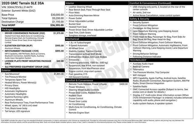 The 2020 GMC Terrain SLE is a stylish and versatile SUV that offers a premium driving experience. With its sleek exterior design, advanced technology features, and capable performance, this Terrain is the perfect companion for your daily commute or weekend adventures.- Skyscape power sunroof with power sunscreen- Rear power programmable liftgate- Elevation Edition with 19 gloss black aluminum wheels, darkened front grille, black exterior accents, and more- Infotainment Package I with 8 diagonal GMC Infotainment System, navigation, HD Rear Vision Camera, and SiriusXM Radio- Driver Convenience Package with Remote Start, dual-zone automatic climate control, heated front seats, and 8-way power driver's seatUnder the hood, the Terrain SLE boasts a 1.5L DOHC engine paired with a 9-speed automatic transmission and all-wheel drive, delivering an impressive 25 city / 28 highway MPG. This powertrain provides the perfect balance of efficiency and capability, ensuring a smooth and confident ride no matter the road conditions.Step inside the spacious cabin and you'll be surrounded by premium materials and thoughtful design. The Terrain's generous cargo space and flexible seating configuration make it easy to accommodate your gear, whether you're heading out on a road trip or tackling a home improvement project. And with the available driver assistance technologies, including Lane Departure Warning and Rear Vision Camera, you can enjoy a heightened sense of safety and confidence behind the wheel.The 2020 GMC Terrain SLE is a standout in its class, offering a winning combination of style, technology, and performance. Experience the difference for yourself by scheduling a test drive at our dealership today. We're confident you'll be impressed by the Terrain's exceptional capabilities and refined driving experience.We look forward to welcoming you to our showroom and helping you find the perfect vehicle to fit your needs and lifestyle. Let's get you behind the wheel of this impressive Terrain SLE and see how it can enhance your daily driving. Visit us soon, and let's make your next automotive purchase a truly rewarding one.This vehicle is being sold as Ingersoll Certified Pre-Owned. This program gives you piece of mind. You will receive. **A Vehicle Inspection and Reconditioning Form. **A Vehicle Carfax. **90 Days or 3000 miles of Powertrain Plus Limited Coverage **A Free Maintenance event including oil change and tire rotation within the first 12mo or 12,000 miles of driving (at an Ingersoll Automotive Location) This is not a manufacturer sponsored program.Do not hesitate, call us now at 860.945.4755 to speak with our guest friendly product consultants to schedule your test drive.Pre-Owned Vehicle Prices do not include government fees and taxes, any finance charges, $997 dealer documentation fees (Pawling Conveyance Fee capped at $175 per NY Law), any emissions testing fees or other fees. All prices, specifications and availability are subject to change without notice. The features and options listed are provided by a 3rd party organization and may not apply to this specific vehicle. Contact dealer for most current information. Not responsible for typographic errors.