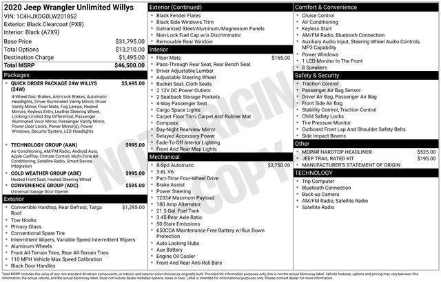 Introducing the rugged and capable 2020 Jeep Wrangler Unlimited Willys, a true off-road icon that's ready to conquer any adventure. With its impressive 3.6L V6 engine, 8-speed automatic transmission, and legendary 4WD system, this Wrangler is built to tackle the toughest terrain with ease.Highlighted features include:- Quick Order Package 24W Willys- Technology Group with Android Auto, SiriusXM radio, and 7 touchscreen display- Convenience Group with universal garage door opener- Cold Weather Group with heated steering wheel and front seats- MOPAR hardtop headliner and all-weather floor matsThe Willys edition adds an extra layer of off-road capability with features like an anti-spin differential rear axle, rock protection sill rails, and a Jeep Trail Rated kit. The bold black exterior with Wrangler and Willys badging gives this Wrangler an unmistakable presence on the road.Inside, the spacious Unlimited cabin offers seating for up to five and a versatile 60/40 split-folding rear seat. Stay connected with the Uconnect 4 infotainment system, featuring Apple CarPlay, Android Auto, and a 7-inch touchscreen. And with the available hardtop, you can enjoy the open-air freedom of the Wrangler while maintaining year-round comfort.Whether you're tackling the daily commute or exploring the great outdoors, the 2020 Jeep Wrangler Unlimited Willys is ready to take you there. With its impressive capabilities, thoughtful features, and iconic Jeep styling, this Wrangler is a true standout in the off-road segment. Schedule a test drive today and experience the unmatched capability and versatility of this remarkable SUV.This vehicle is being sold as Ingersoll Certified Pre-Owned. This program gives you piece of mind. You will receive. **A Vehicle Inspection and Reconditioning Form. **A Vehicle Carfax. **90 Days or 3000 miles of Powertrain Plus Limited Coverage **A Free Maintenance event including oil change and tire rotation within the first 12mo or 12,000 miles of driving (at an Ingersoll Automotive Location) This is not a manufacturer sponsored program.Do not hesitate, call us now at 860.945.4755 to speak with our guest friendly product consultants to schedule your test drive.Pre-Owned Vehicle Prices do not include government fees and taxes, any finance charges, $997 dealer documentation fees (Pawling Conveyance Fee capped at $175 per NY Law), any emissions testing fees or other fees. All prices, specifications and availability are subject to change without notice. The features and options listed are provided by a 3rd party organization and may not apply to this specific vehicle. Contact dealer for most current information. Not responsible for typographic errors.