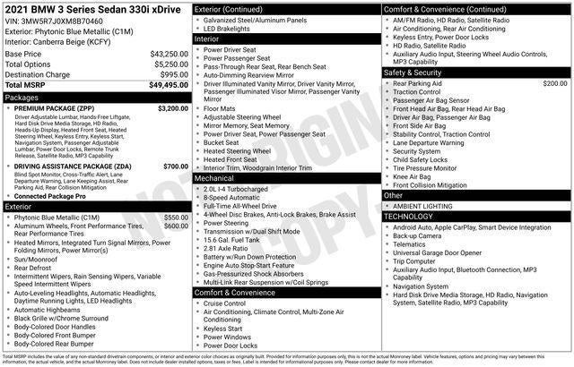 Discover the epitome of sophisticated driving with this stunning 2021 BMW 3 Series 330i xDrive. Boasting a sleek Phytonic Blue Metallic exterior and a well-appointed interior, this BMW is poised to elevate your daily commute and weekend adventures alike.- 19 x 8 Double-Spoke Bi-Color Orbit Grey Wheels- Park Distance Control- Driving Assistance Package (Lane Departure Warning, Active Blind Spot Detection, Park Distance Control, Active Driving Assistant, Cross-Traffic Alert Rear, Speed Limit Info)- Premium Package (Ambient Lighting, Comfort Access Keyless Entry, Lumbar Support, Live Cockpit Pro with Navigation, Head-Up Display, Heated Steering Wheel, Heated Front Seats)Powered by a robust 2.0L 4-Cylinder DOHC 16V Turbocharged engine paired with an 8-Speed Automatic Sport transmission, this BMW 330i xDrive delivers an exhilarating and efficient driving experience. With an impressive 25 city / 34 highway MPG, you'll enjoy the perfect balance of performance and fuel economy.Step inside the refined cabin and you'll be surrounded by premium features that cater to your every need. Sink into the supportive Sport Seats, take advantage of the Hands-Free Bluetooth® and USB Audio Connection, and let the Ambient Lighting set the perfect mood. The Live Cockpit Pro with Navigation system provides seamless connectivity and intuitive control, while the Head-Up Display keeps crucial information in your line of sight.Safety is paramount in this BMW, with features like Active Blind Spot Detection, Lane Departure Warning, and the Driving Assistance Package providing added peace of mind. The Exterior Parking Camera Rear and Park Distance Control make navigating tight spaces a breeze.Elevate your driving experience with this meticulously maintained 2021 BMW 3 Series 330i xDrive. Schedule a test drive today and discover the exceptional craftsmanship, performance, and technology that make this BMW a true standout in its class.This vehicle is being sold with Buyer's Guide Coverage. Ingersoll Automotive will provide a vehicle inspection and reconditioning form, a vehicle Carfax, and coverage through the FTC buyers guide as outlined.Do not hesitate, call us now at 860.945.4755 to speak with our guest friendly product consultants to schedule your test drive.Pre-Owned Vehicle Prices do not include government fees and taxes, any finance charges, $997 dealer documentation fees (Pawling Conveyance Fee capped at $175 per NY Law), any emissions testing fees or other fees. All prices, specifications and availability are subject to change without notice. The features and options listed are provided by a 3rd party organization and may not apply to this specific vehicle. Contact dealer for most current information. Not responsible for typographic errors.