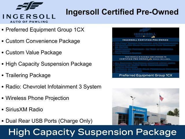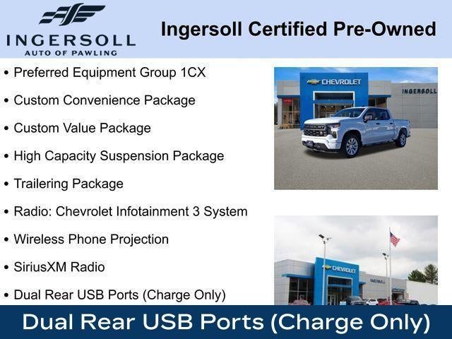 Odometer is 24604 miles below market average! Clean CARFAX.10-Way Power Driver Seat w/Lumbar, 120-Volt Instrument Panel Power Outlet, 3.5 Monochromatic Display Driver Info Center, 6-Speaker Audio System, Apple CarPlay/Android Auto, Auto High-beam Headlights, Bluetooth® For Phone, Chevytec Spray-On Black Bedliner, Color-Keyed Carpeting Floor Covering, Compass, Custom Convenience Package, Custom Value Package, Deep-Tinted Glass, Dual Rear USB Ports (Charge Only), Electric Rear-Window Defogger, Electrical Steering Column Lock, Electronic Cruise Control, EZ Lift Power Lock & Release Tailgate, Front Frame-Mounted Black Recovery Hooks, Front Rubberized Vinyl Floor Mats, Fully automatic headlights, HD Rear Vision Camera, High Capacity Suspension Package, IntelliBeam Automatic High Beam On/Off, LED Cargo Area Lighting, Manual Tilt Wheel Steering Column, OnStar & Chevrolet Connected Services Capable, Power Front Windows w/Driver Express Up/Down, Power Front Windows w/Passenger Express Down, Power Rear Windows w/Express Down, Preferred Equipment Group 1CX, Premium audio system: Chevrolet Infotainment 3, Radio: Chevrolet Infotainment 3 System, Rear 60/40 Folding Bench Seat (Folds Up), Rear Rubberized-Vinyl Floor Mats, Remote Keyless Entry, Remote Vehicle Starter System, SiriusXM Radio, Standard Tailgate, Theft Deterrent System (Unauthorized Entry), Trailering Package, Wheels: 20 x 9 Bright Silver Painted Aluminum, Wi-Fi Hot Spot Capable, Wireless Phone Projection.Summit White 2022 Chevrolet Silverado 1500 Custom 4D Crew Cab 4WD 2.7L Turbo 8-Speed AutomaticCertification Program Details: This vehicle is being sold as Ingersoll Certified Pre-Owned. This program gives you piece of mind. You will receive. **A Vehicle Inspection and Reconditioning Form. **A Vehicle Carfax. **90 Days or 4000 miles of Powertrain Plus Limited Coverage **A Free Maintenance event including oil change and tire rotation within the first 12mo or 12,000 miles of driving (at an Ingersoll Automotive Location). This vehicle is eligible to be upgraded to Ingersoll Certified Plus for $749. That will give you the additional benefits of 12mo or 12,000 miles of limited exclusionary coverage, 6 years or up to 100,000 miles of powertrain limited coverage (from original in-service date), courtesy transportation for covered repairs, and road side assistance. **A Vehicle Exchange Program if dissatisfied in the first 3 days or 150 miles of ownership. This is not a manufacturer sponsored programDo not hesitate, call us now at 845.878.6900 to speak with our guest friendly product consultants to schedule your test drive.Pre-Owned Vehicle Prices do not include government fees and taxes, any finance charges, $175 dealer documentation fees (Danbury and Watertown Conveyance Fee at $997), any emissions testing fees or other fees. All prices, specifications and availability are subject to change without notice. The features and options listed are provided by a 3rd party organization and may not apply to this specific vehicle. Contact dealer for most current information. Not responsible for typographic errors.