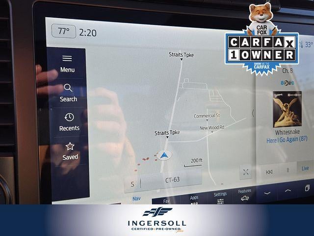 The exterior of this F-150 Platinum exudes a bold and refined presence with its Star White Metallic Tri-Coat paint and striking 20-inch polished aluminum wheels. The FX4 Off-Road Package adds rugged capability, with features like off-road tuned shock absorbers, skid plates, and rock crawl mode, ensuring you can tackle any terrain with confidence.
