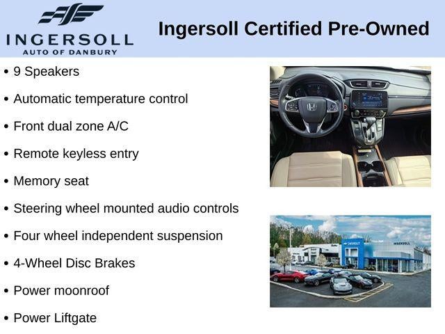 The 2022 Honda CR-V Touring is a versatile and well-equipped SUV that's ready to elevate your driving experience. With its sleek design, advanced technology, and impressive performance, this CR-V is the perfect companion for your adventures.Highlighted features of this remarkable vehicle include:- 9 Speakers- Adaptive Cruise Control- Blind Spot Information (BSI) System warning- Forward collision: Collision Mitigation Braking System (CMBS) + FCW mitigation- Leather Seat Trim- Navigation system: Honda Satellite-Linked Navigation System- Power Liftgate- Roof rack: rails onlyUnder the hood, the CR-V Touring boasts a 1.5L I4 DOHC 16V engine, paired with a CVT transmission and AWD, delivering an exceptional blend of power and efficiency. With an EPA-estimated 27 mpg in the city and 32 mpg on the highway, this SUV ensures you can go further on every tank.The interior of the CR-V Touring is a true sanctuary, with features like dual-zone automatic climate control, heated front seats, and a premium audio system with 9 speakers. The spacious cabin and versatile cargo area make it the perfect companion for your daily commute, weekend getaways, and everything in between.Safety is of the utmost importance, and the CR-V Touring delivers with a comprehensive suite of advanced safety technologies. From the Collision Mitigation Braking System to the Blind Spot Information System, you can drive with confidence, knowing you and your loved ones are well-protected.Experience the perfect blend of style, technology, and capability in the 2022 Honda CR-V Touring. This SUV is ready to elevate your driving experience and become an integral part of your lifestyle. Visit our showroom today to take a closer look and discover how this exceptional vehicle can enhance your life on the road.This vehicle is being sold as Ingersoll Certified Pre-Owned. This program gives you peace of mind. You will receive. **A Vehicle Inspection and Reconditioning Form. **A Vehicle Carfax. **90 Days or 3000 miles of Powertrain Plus Limited Coverage **A Free Maintenance event including oil change and tire rotation within the first 12mo or 12,000 miles of driving (at an Ingersoll Automotive Location). This vehicle is eligible to be upgraded to Ingersoll Certified Plus for $749. That will give you the additional benefits of 12mo or 12,000 miles of limited exclusionary coverage, 6 years or up to 100,000 miles of powertrain limited coverage (from original in-service date), courtesy transportation for covered repairs, and road side assistance. **A Vehicle Exchange Program if dissatisfied in the first 3 days or 150 miles of ownership. This is not a manufacturer sponsored program.Pre-Owned Vehicle Prices do not include government fees and taxes, any finance charges, $997 dealer documentation fees (Pawling Conveyance Fee capped at $175 per NY Law), any emissions testing fees or other fees. All prices, specifications and availability are subject to change without notice. The features and options listed are provided by a 3rd party organization and may not apply to this specific vehicle. Contact dealer for most current information. Not responsible for typographic errors.