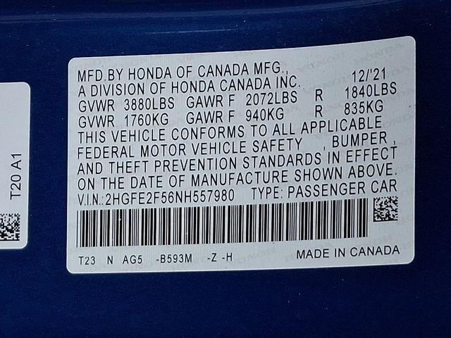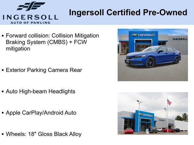 Priced below KBB Fair Purchase Price! Odometer is 4253 miles below market average! Clean CARFAX.Apple CarPlay/Android Auto, Auto High-beam Headlights, Exterior Parking Camera Rear, Forward collision: Collision Mitigation Braking System (CMBS) + FCW mitigation, Wheels: 18 Gloss Black Alloy.Blue 2022 Honda Civic Sport 4D Sedan FWD 2.0L I4 DOHC 16V i-VTEC CVTCertification Program Details: This vehicle is being sold as Ingersoll Certified Pre-Owned. This program gives you piece of mind. You will receive. **A Vehicle Inspection and Reconditioning Form. **A Vehicle Carfax. **90 Days or 4000 miles of Powertrain Plus Limited Coverage **A Free Maintenance event including oil change and tire rotation within the first 12mo or 12,000 miles of driving (at an Ingersoll Automotive Location). This vehicle is eligible to be upgraded to Ingersoll Certified Plus for $749. That will give you the additional benefits of 12mo or 12,000 miles of limited exclusionary coverage, 6 years or up to 100,000 miles of powertrain limited coverage (from original in-service date), courtesy transportation for covered repairs, and road side assistance. **A Vehicle Exchange Program if dissatisfied in the first 3 days or 150 miles of ownership. This is not a manufacturer sponsored programDo not hesitate, call us now at 845.878.6900 to speak with our guest friendly product consultants to schedule your test drive.Pre-Owned Vehicle Prices do not include government fees and taxes, any finance charges, $175 dealer documentation fees (Danbury and Watertown Conveyance Fee at $997), any emissions testing fees or other fees. All prices, specifications and availability are subject to change without notice. The features and options listed are provided by a 3rd party organization and may not apply to this specific vehicle. Contact dealer for most current information. Not responsible for typographic errors.