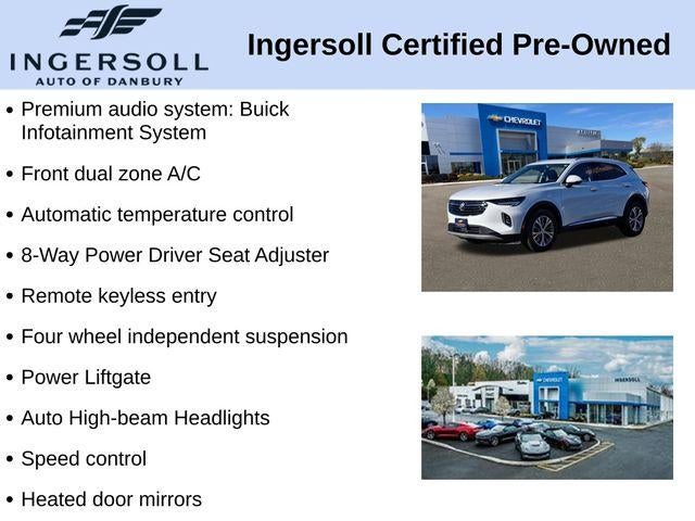 Experience the exceptional 2023 Buick Envision Preferred, a sophisticated and versatile SUV that blends style, technology, and performance. This meticulously maintained Envision, with just 22,467 miles on the odometer, is the perfect companion for your adventures.Boasting a stunning White exterior and a well-appointed interior, the Envision Preferred is equipped with an impressive array of features that cater to your every need:• 2.0L Turbocharged engine with 9-Speed Automatic transmission and Intelligent All-Wheel Drive• Buick Infotainment System with 7-Speaker Audio and SiriusXM Radio• Dual-Zone Automatic Climate Control for personalized comfort• Power Driver's Seat with 8-Way Adjustability• Heated Steering Wheel and Heated Front Seats for chilly mornings• Wireless Apple CarPlay and Android Auto for seamless smartphone integration• Power Liftgate for effortless cargo loading• Automatic Emergency Braking and Lane Keep Assist for added peace of mindThe 2023 Buick Envision Preferred delivers an exceptional driving experience, with an EPA-estimated 22 MPG in the city and 29 MPG on the highway. Its refined handling and responsive powertrain make it a joy to pilot, whether navigating crowded city streets or winding country roads.Designed with your comfort and convenience in mind, the Envision Preferred offers a spacious and well-appointed cabin, with ample room for passengers and cargo. The split-folding rear seats provide flexibility, allowing you to accommodate your ever-changing needs.This meticulously maintained Envision Preferred is a testament to Buick's commitment to quality and craftsmanship. It's the perfect blend of style, technology, and performance, ready to elevate your driving experience.We invite you to schedule a test drive and experience the exceptional 2023 Buick Envision Preferred for yourself. Let us demonstrate how this remarkable SUV can enhance your daily commute and weekend adventures. We're confident that once you experience its remarkable capabilities, you'll be eager to make it your own.This vehicle is being sold as Ingersoll Certified Pre-Owned. This program gives you peace of mind. You will receive. **A Vehicle Inspection and Reconditioning Form. **A Vehicle Carfax. **90 Days or 3000 miles of Powertrain Plus Limited Coverage **A Free Maintenance event including oil change and tire rotation within the first 12mo or 12,000 miles of driving (at an Ingersoll Automotive Location). This vehicle is eligible to be upgraded to Ingersoll Certified Plus for $749. That will give you the additional benefits of 12mo or 12,000 miles of limited exclusionary coverage, 6 years or up to 100,000 miles of powertrain limited coverage (from original in-service date), courtesy transportation for covered repairs, and road side assistance. **A Vehicle Exchange Program if dissatisfied in the first 3 days or 150 miles of ownership. This is not a manufacturer sponsored programPre-Owned Vehicle Prices do not include government fees and taxes, any finance charges, $997 dealer documentation fees (Pawling Conveyance Fee capped at $175 per NY Law), any emissions testing fees or other fees. All prices, specifications and availability are subject to change without notice. The features and options listed are provided by a 3rd party organization and may not apply to this specific vehicle. Contact dealer for most current information. Not responsible for typographic errors.