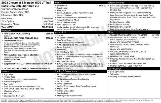 Discover the power and capability of the 2023 Chevrolet Silverado 1500 LT Trail Boss. This rugged and versatile pickup is built to take on any challenge, whether you're navigating the job site, towing your boat to the lake, or exploring the great outdoors.- Dark Essentials Package (LPO)- Protection Package- Trailering Package- Integrated Trailer Brake Controller- 5.3L V8 EcoTec3 Engine- 10-Speed Automatic Transmission- 4-Wheel Drive- Chevytec Spray-On Black Bedliner- Black Tailgate CHEVROLET Lettering (LPO)- Black Name Plates (LPO)Under the hood, the powerful 5.3L V8 EcoTec3 engine delivers an impressive 355 horsepower and 383 lb-ft of torque, providing the muscle you need to tackle any task. Paired with a smooth-shifting 10-speed automatic transmission, this powertrain offers a dynamic and efficient driving experience.The Silverado LT Trail Boss is equipped with a host of advanced features that enhance both capability and convenience. The Integrated Trailer Brake Controller and Trailering Package make it easy to haul your toys, while the Chevytec Spray-On Black Bedliner and Black Tailgate CHEVROLET Lettering add a touch of rugged style. Inside, the Dual-Zone Automatic Climate Control, Heated Steering Wheel, and Wireless Charging keep you comfortable and connected on the go.This Silverado also boasts a comprehensive suite of safety technologies, including Forward Collision Alert, Automatic Emergency Braking, and Lane Keep Assist with Lane Departure Warning, giving you peace of mind on every journey.Whether you're tackling tough terrain or navigating the daily commute, the 2023 Chevrolet Silverado 1500 LT Trail Boss is the perfect companion. Experience the perfect blend of power, capability, and technology – visit our showroom today and discover how this remarkable truck can transform the way you drive.This vehicle is being sold as Ingersoll Certified Pre-Owned. This program gives you peace of mind. You will receive. **A Vehicle Inspection and Reconditioning Form. **A Vehicle Carfax. **90 Days or 3000 miles of Powertrain Plus Limited Coverage **A Free Maintenance event including oil change and tire rotation within the first 12mo or 12,000 miles of driving (at an Ingersoll Automotive Location). This vehicle is eligible to be upgraded to Ingersoll Certified Plus for $749. That will give you the additional benefits of 12mo or 12,000 miles of limited exclusionary coverage, 6 years or up to 100,000 miles of powertrain limited coverage (from original in-service date), courtesy transportation for covered repairs, and road side assistance. **A Vehicle Exchange Program if dissatisfied in the first 3 days or 150 miles of ownership. This is not a manufacturer sponsored program.Pre-Owned Vehicle Prices do not include government fees and taxes, any finance charges, $997 dealer documentation fees (Pawling Conveyance Fee capped at $175 per NY Law), any emissions testing fees or other fees. All prices, specifications and availability are subject to change without notice. The features and options listed are provided by a 3rd party organization and may not apply to this specific vehicle. Contact dealer for most current information. Not responsible for typographic errors.