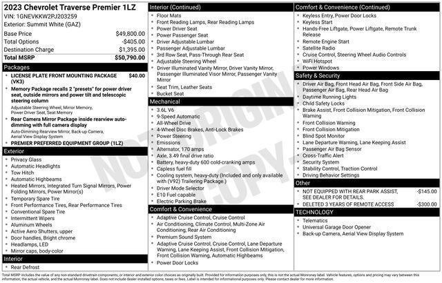 Priced below KBB Fair Purchase Price!6-Way Power Front Passenger Seat, 8-Way Power Driver Seat Adjuster, Apple CarPlay/Android Auto, Auto High-beam Headlights, Bose Premium 10-Speaker Audio System Feature, Exterior Parking Camera Rear, Heated 2nd Row Outboard Position Seats, Heated Driver & Front Passenger Seats, Heated steering wheel, Memory seat, Navigation System, Power Liftgate, Preferred Equipment Group 1LZ, Radio: Chevrolet Infotainment 3 Plus System w/Navi, Remote keyless entry, SiriusXM w/360L, Steering wheel mounted audio controls, Ventilated Driver & Front Passenger Seats, Wheels: 20 Metallic Machined-Face Aluminum.Summit White 2023 Chevrolet Traverse Premier 4D Sport Utility AWD 3.6L V6 SIDI VVT 9-Speed AutomaticCertification Program Details: This vehicle is being sold as Ingersoll Certified Pre-Owned. This program gives you piece of mind. You will receive. **A Vehicle Inspection and Reconditioning Form. **A Vehicle Carfax. **90 Days or 4000 miles of Powertrain Plus Limited Coverage **A Free Maintenance event including oil change and tire rotation within the first 12mo or 12,000 miles of driving (at an Ingersoll Automotive Location). This vehicle is eligible to be upgraded to Ingersoll Certified Plus for $749. That will give you the additional benefits of 12mo or 12,000 miles of limited exclusionary coverage, 6 years or up to 100,000 miles of powertrain limited coverage (from original in-service date), courtesy transportation for covered repairs, and road side assistance. **A Vehicle Exchange Program if dissatisfied in the first 3 days or 150 miles of ownership. This is not a manufacturer sponsored programDo not hesitate, call us now at 845.878.6900 to speak with our guest friendly product consultants to schedule your test drive.Pre-Owned Vehicle Prices do not include government fees and taxes, any finance charges, $175 dealer documentation fees (Danbury and Watertown Conveyance Fee at $997), any emissions testing fees or other fees. All prices, specifications and availability are subject to change without notice. The features and options listed are provided by a 3rd party organization and may not apply to this specific vehicle. Contact dealer for most current information. Not responsible for typographic errors.