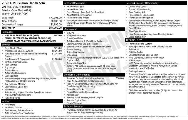 Experience the pinnacle of luxury and capability with this stunning 2023 GMC Yukon Denali. This premium full-size SUV is designed to elevate your driving experience, offering an unparalleled blend of sophistication, power, and advanced technology.- Power-Retractable Assist Steps with Perimeter Lighting- Panoramic Dual-Pane Power Sunroof- Adaptive Cruise Control- Max Trailering Package with ProGrade Trailering System- 22 Multi-Spoke Gloss Black WheelsCommanding the road with its bold presence, the Yukon Denali's sleek Onyx Black exterior exudes confidence and refinement. Step inside and you'll be enveloped in a cabin that exemplifies GMC's attention to detail, featuring premium Perforated Leather Seating Surfaces and a Heated Steering Wheel. The Bose 14-Speaker Surround Sound System with CenterPoint provides an immersive audio experience, while the 15 Diagonal Multi-Color Head-Up Display keeps vital information within your line of sight.Beneath the hood, the potent EcoTec3 6.2L V8 engine, paired with a 10-Speed Automatic Transmission, delivers impressive power and efficiency. The Yukon Denali's 4-Wheel Drive capabilities, Magnetic Ride Control Suspension, and Hill Descent Control ensure you can tackle any road with confidence, whether navigating city streets or venturing off the beaten path.For added convenience and peace of mind, this Yukon Denali is equipped with a wealth of advanced safety features, including Automatic Emergency Braking, Forward Collision Alert, Lane Keep Assist with Lane Departure Warning, and Rear Pedestrian Alert. The Hands-Free Power Programmable Rear Liftgate and Wireless Charging further enhance the driving experience, making your daily routine more seamless.This exceptional 2023 GMC Yukon Denali is a true embodiment of luxury, performance, and capability. We invite you to experience its unrivaled refinement and versatility firsthand. Schedule a test drive today and discover the ultimate in full-size SUV excellence.This vehicle is being sold as Ingersoll Certified Pre-Owned. This program gives you peace of mind. You will receive. **A Vehicle Inspection and Reconditioning Form. **A Vehicle Carfax. **90 Days or 3000 miles of Powertrain Plus Limited Coverage **A Free Maintenance event including oil change and tire rotation within the first 12mo or 12,000 miles of driving (at an Ingersoll Automotive Location). This vehicle is eligible to be upgraded to Ingersoll Certified Plus for $749. That will give you the additional benefits of 12mo or 12,000 miles of limited exclusionary coverage, 6 years or up to 100,000 miles of powertrain limited coverage (from original in-service date), courtesy transportation for covered repairs, and road side assistance. **A Vehicle Exchange Program if dissatisfied in the first 3 days or 150 miles of ownership. This is not a manufacturer sponsored program.Pre-Owned Vehicle Prices do not include government fees and taxes, any finance charges, $997 dealer documentation fees (Pawling Conveyance Fee capped at $175 per NY Law), any emissions testing fees or other fees. All prices, specifications and availability are subject to change without notice. The features and options listed are provided by a 3rd party organization and may not apply to this specific vehicle. Contact dealer for most current information. Not responsible for typographic errors.