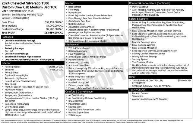 Clean CARFAX.Sterling Gray Metallic 2024 Chevrolet Silverado 1500 Custom 4D Crew Cab 4WD 2.7L I4 Turbocharged DOHC 16V LEV3-SULEV30 310hp 8-Speed AutomaticDo not hesitate, call us now at 203.730.5766 to speak with our guest friendly product consultants to schedule your test drive.Pre-Owned Vehicle Prices do not include government fees and taxes, any finance charges, $997 dealer documentation fees (Pawling Conveyance Fee capped at $175 per NY Law), any emissions testing fees or other fees. All prices, specifications and availability are subject to change without notice. The features and options listed are provided by a 3rd party organization and may not apply to this specific vehicle. Contact dealer for most current information. Not responsible for typographic errors.