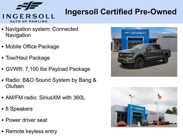 Priced below KBB Fair Purchase Price! Clean CARFAX.8 Speakers, AM/FM radio: SiriusXM with 360L, Auto High-beam Headlights, Auto-dimming door mirrors, Auto-dimming Rear-View mirror, Console Worksurface, Electronic Locking w/3.73 Axle Ratio, Front Bucket Seats, GVWR: 7,100 lbs Payload Package, Heated door mirrors, Heated front seats, Integrated Trailer Brake Controller, Mobile Office Package, Navigation system: Connected Navigation, Partitioned Lockable Rear Storage, Power driver seat, Radio: B&O Sound System by Bang & Olufsen, Remote keyless entry, SYNC 4 w/Enhanced Voice Recognition, Tow/Haul Package, Turn signal indicator mirrors, Wheels: 18 Alloy w/Dark Matte Finish, Wireless Charging.Gray 2024 Ford F-150 Tremor 4D SuperCrew 4WD 3.5L V6 EcoBoost 10-Speed AutomaticCertification Program Details: This vehicle is being sold as Ingersoll Certified Pre-Owned. This program gives you piece of mind. You will receive. **A Vehicle Inspection and Reconditioning Form. **A Vehicle Carfax. **90 Days or 4000 miles of Powertrain Plus Limited Coverage **A Free Maintenance event including oil change and tire rotation within the first 12mo or 12,000 miles of driving (at an Ingersoll Automotive Location). This vehicle is eligible to be upgraded to Ingersoll Certified Plus for $749. That will give you the additional benefits of 12mo or 12,000 miles of limited exclusionary coverage, 6 years or up to 100,000 miles of powertrain limited coverage (from original in-service date), courtesy transportation for covered repairs, and road side assistance. **A Vehicle Exchange Program if dissatisfied in the first 3 days or 150 miles of ownership. This is not a manufacturer sponsored programDo not hesitate, call us now at 845.878.6900 to speak with our guest friendly product consultants to schedule your test drive.Pre-Owned Vehicle Prices do not include government fees and taxes, any finance charges, $175 dealer documentation fees (Danbury and Watertown Conveyance Fee at $997), any emissions testing fees or other fees. All prices, specifications and availability are subject to change without notice. The features and options listed are provided by a 3rd party organization and may not apply to this specific vehicle. Contact dealer for most current information. Not responsible for typographic errors.