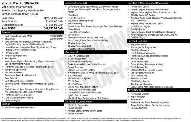 Discover the epitome of modern luxury and performance with this stunning 2025 BMW X3 30 xDrive. This meticulously maintained SUV boasts a sleek Gray exterior, complemented by a sophisticated and well-appointed interior that exudes BMW's renowned craftsmanship.Packed with an impressive array of features, this X3 30 xDrive is designed to elevate your driving experience. Key highlights include:- Wireless Device Charging- Panoramic Moonroof- Heated Front Seats- Power Liftgate- Surround View Camera System- Adaptive Cruise Control- Harman Kardon Premium Audio SystemPowered by a robust I4 engine and equipped with an 8-Speed Automatic transmission, this all-wheel-drive BMW delivers an exceptional blend of power and efficiency, with an impressive 27 city / 33 highway MPG rating.Step inside and you'll be greeted by a spacious, well-appointed cabin that seamlessly blends form and function. The Veganza Perforated and Quilted Upholstery, paired with the Sport Seats and Power Front Seats, provide unparalleled comfort and support, while the intuitive BMW Maps Navigation system and Apple CarPlay/Android Auto compatibility keep you connected and in control.Safety is also a top priority, with features like Blind Spot Monitoring, Lane Departure Warning, and a comprehensive suite of airbags ensuring your peace of mind on the road.With its exceptional performance, cutting-edge technology, and refined elegance, this 2025 BMW X3 30 xDrive is the perfect choice for the discerning driver who demands the very best. We invite you to experience the thrill of driving this remarkable vehicle firsthand. Contact us today to schedule a test drive and discover why the BMW X3 is the ultimate luxury SUV.This vehicle is being sold as Ingersoll Certified Pre-Owned. This program gives you piece of mind. You will receive. **A Vehicle Inspection and Reconditioning Form. **A Vehicle Carfax. **90 Days or 3000 miles of Powertrain Plus Limited Coverage **A Free Maintenance event including oil change and tire rotation within the first 12mo or 12,000 miles of driving (at an Ingersoll Automotive Location) This is not a manufacturer sponsored program.Do not hesitate, call us now at 860.945.4755 to speak with our guest friendly product consultants to schedule your test drive.Pre-Owned Vehicle Prices do not include government fees and taxes, any finance charges, $997 dealer documentation fees (Pawling Conveyance Fee capped at $175 per NY Law), any emissions testing fees or other fees. All prices, specifications and availability are subject to change without notice. The features and options listed are provided by a 3rd party organization and may not apply to this specific vehicle. Contact dealer for most current information. Not responsible for typographic errors.