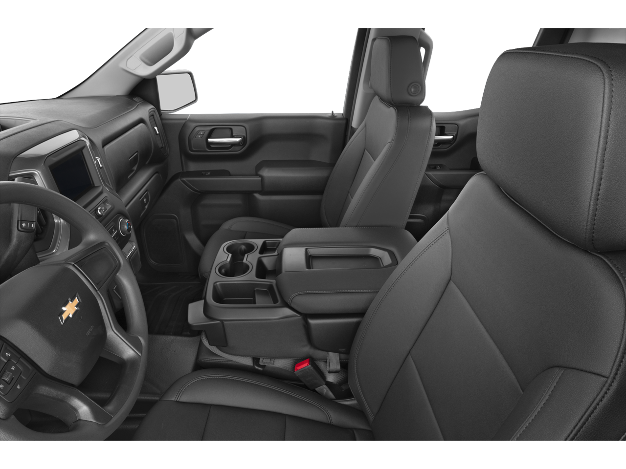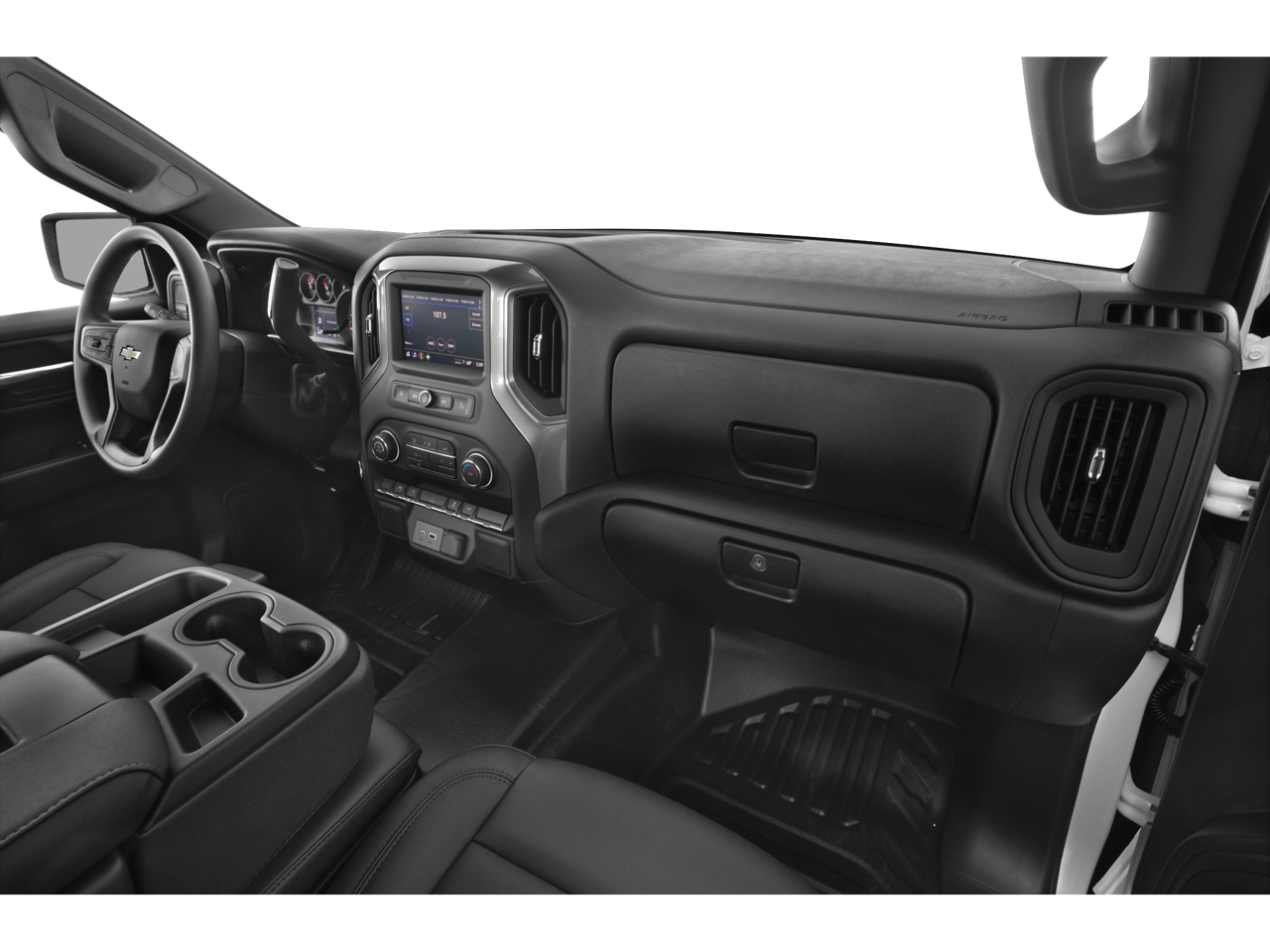 The exterior of the Silverado WT exudes a bold, confident style with its sleek White paint and sturdy black bumpers. Step inside and you'll find a well-appointed cabin with premium vinyl seating, a 40/20/40 front split-bench, and a 60/40 folding rear bench, providing ample space and comfort for you and your passengers.