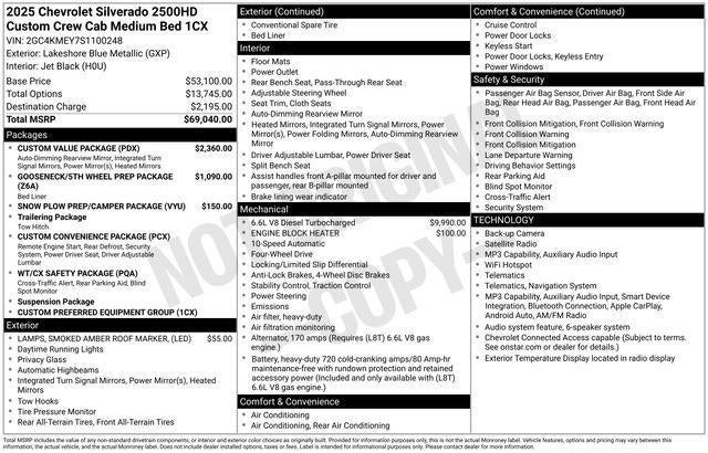 Odometer is 11549 miles below market average! CARFAX One-Owner. Clean CARFAX.10-Way Power Driver Seat Adjuster with Lumbar, 120-Volt Interior Power Outlet, 170 Amp Alternator, 2-Speed Electronic Shift Transfer Case, 220 Amp Alternator, 3.5 Diagonal Monochromatic Display DIC, 3.73 Rear Axle Ratio, 6-Speaker Audio System, Apple CarPlay/Android Auto, Auto High-beam Headlights, Black Chevytec Spray-on Bedliner, Black Mirror Caps, Bluetooth® For Phone, Chevrolet Connected Access Capable, Color-Keyed Carpeting Floor Covering, Compass, Custom Convenience Package, Custom Value Package, CX Safety Package, Deep-Tinted Glass, Durabed Pickup Bed, Electric Rear-Window Defogger, Electronic Cruise Control with Set and Resume Speed, Engine Block Heater, EZ Lift Power Lock and Release Tailgate, Front Rubberized Vinyl Floor Mats, Fully automatic headlights, Gooseneck/5th Wheel Prep Package, HD Rear Vision Camera, Heated and Auto-Dimming Vertical Trailering Mirrors, Heated Vertical Trailering Mirrors, Lane Change Alert with Side Blind Zone Alert, LED Cargo Area Lighting, Locking Tailgate, Manual Tailgate Function with No EZ Lift, Manual Tilt-Wheel Steering Column, OnStar Services Capable, Power Door Locks, Power Front Windows with Driver Express Up/Down, Power Front Windows with Passenger Express Down, Power Rear Windows with Express Down, Preferred Equipment Group 1CX, Push Button Start, Radio: Chevrolet Infotainment 3 System, Rear 60/40 Folding Bench Seat (folds Up), Rear Rubberized Vinyl Floor Mats, Remote Keyless Entry, Remote Vehicle Starter System, SiriusXM with 360L Trial Subscription, Snow Plow Prep/Camper Package, Standard Tailgate, Suspension Package, Unauthorized Entry Theft-Deterrent System, Wheels: 20 10-Spoke Machined Aluminum, Wi-Fi Hotspot Capable, Wireless Phone Projection.Lakeshore Blue Metallic 2025 Chevrolet Silverado 2500HD Custom 4D Crew Cab 4WD Duramax 6.6L V8 Turbodiesel 10-Speed AutomaticCertification Program Details: This vehicle is being sold as Ingersoll Certified Pre-Owned. This program gives you piece of mind. You will receive. **A Vehicle Inspection and Reconditioning Form. **A Vehicle Carfax. **90 Days or 4000 miles of Powertrain Plus Limited Coverage **A Free Maintenance event including oil change and tire rotation within the first 12mo or 12,000 miles of driving (at an Ingersoll Automotive Location). This vehicle is eligible to be upgraded to Ingersoll Certified Plus for $749. That will give you the additional benefits of 12mo or 12,000 miles of limited exclusionary coverage, 6 years or up to 100,000 miles of powertrain limited coverage (from original in-service date), courtesy transportation for covered repairs, and road side assistance. **A Vehicle Exchange Program if dissatisfied in the first 3 days or 150 miles of ownership. This is not a manufacturer sponsored programDo not hesitate, call us now at 845.878.6900 to speak with our guest friendly product consultants to schedule your test drive.Pre-Owned Vehicle Prices do not include government fees and taxes, any finance charges, $175 dealer documentation fees (Danbury and Watertown Conveyance Fee at $997), any emissions testing fees or other fees. All prices, specifications and availability are subject to change without notice. The features and options listed are provided by a 3rd party organization and may not apply to this specific vehicle. Contact dealer for most current information. Not responsible for typographic errors.
