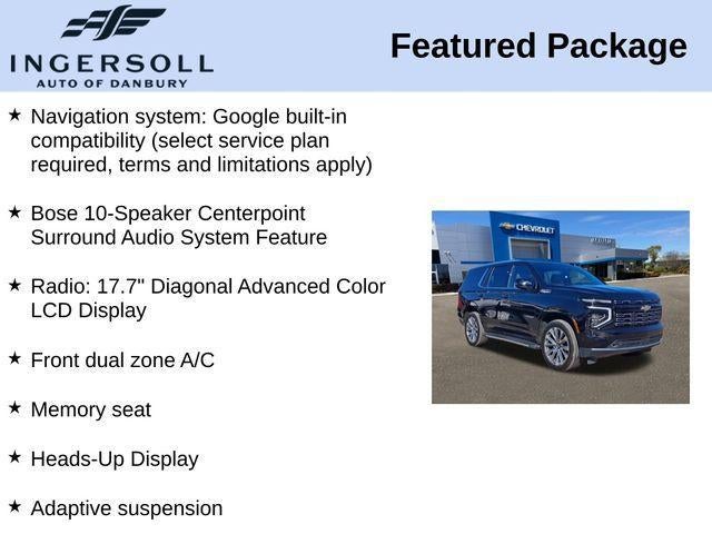Elevate your driving experience with the 2025 Chevrolet Tahoe High Country. This exceptional full-size SUV boasts a commanding presence and uncompromising capability, making it the ultimate choice for those who demand the best.Tailored to your preferences, this Tahoe High Country comes equipped with:• LPO, WHEEL LOCKS, SET OF 4 (dealer-installed)• Navigation system: Google built-in compatibility (select service plan required, terms and limitations apply)• Preferred Equipment Group 3LZ• Bose 10-Speaker Centerpoint Surround Audio System Feature• Magnetic Ride Control Suspension• Heads-Up Display• Wireless Phone Charging• Heated and Ventilated Front Seats• Power Release 2nd Row Bucket Seats• Wheels: 22 x 9 Bright Machined AluminumThe 6.2L V8 EcoTec3 engine, paired with a 10-speed automatic transmission, delivers impressive power and efficiency, with an EPA-estimated 14 city/18 highway MPG. Magnetic Ride Control and the four-wheel independent suspension provide a smooth, controlled ride, while the 4WD system ensures confident handling in any conditions.Inside, the Tahoe High Country surrounds you in luxurious comfort. Perforated leather seating, heated and ventilated front seats, and a Bose premium audio system create an unparalleled driving experience. The spacious cabin offers ample room for passengers and cargo, with a power-folding third-row seat and a hands-free power liftgate for effortless loading and unloading.Cutting-edge technology is at your fingertips, including a 17.7-inch diagonal advanced color LCD display, Google built-in navigation, and wireless phone charging. The Heads-Up Display projects vital information directly onto the windshield, keeping your eyes on the road ahead.Safety is paramount, with features like Front Pedestrian and Bicyclist Braking, Automatic Emergency Braking, and a suite of airbags to protect you and your loved ones.Experience the pinnacle of full-size SUV luxury and capability in the 2025 Chevrolet Tahoe High Country. Schedule a test drive today and discover how this exceptional vehicle can elevate your driving experience.This vehicle is being sold as Ingersoll Certified Pre-Owned. This program gives you piece of mind. You will receive. **A Vehicle Inspection and Reconditioning Form. **A Vehicle Carfax. **90 Days or 3000 miles of Powertrain Plus Limited Coverage **A Free Maintenance event including oil change and tire rotation within the first 12mo or 12,000 miles of driving (at an Ingersoll Automotive Location). This vehicle is eligible to be upgraded to Ingersoll Certified Plus for $749. That will give you the additional benefits of 12mo or 12,000 miles of limited exclusionary coverage, 6 years or up to 100,000 miles of powertrain limited coverage (from original in-service date), courtesy transportation for covered repairs, and road side assistance. **A Vehicle Exchange Program if dissatisfied in the first 3 days or 150 miles of ownership. This is not a manufacturer sponsored programDo not hesitate, call us now at 203.730.5766 to speak with our guest friendly product consultants to schedule your test drive.Pre-Owned Vehicle Prices do not include government fees and taxes, any finance charges, $997 dealer documentation fees (Pawling Conveyance Fee capped at $175 per NY Law), any emissions testing fees or other fees. All prices, specifications and availability are subject to change without notice. The features and options listed are provided by a 3rd party organization and may not apply to this specific vehicle. Contact dealer for most current information. Not responsible for typographic errors.