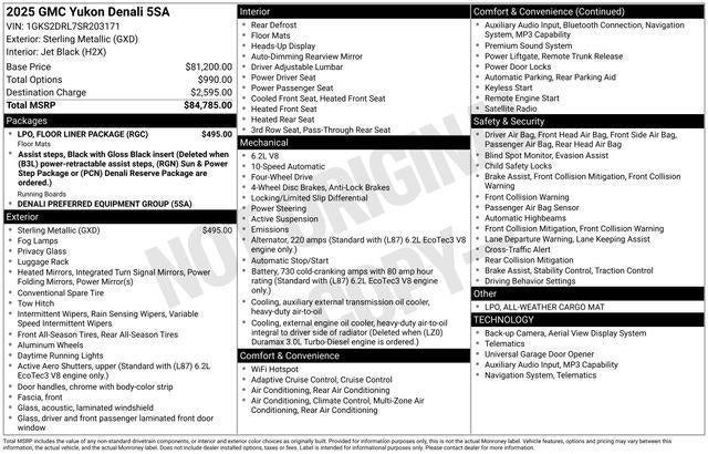 Clean CARFAX.Sterling Metallic 2025 GMC Yukon Denali 4D Sport Utility 4WD EcoTec3 6.2L V8 10-Speed Automatic with OverdriveDo not hesitate, call us now at 203.730.5766 to speak with our guest friendly product consultants to schedule your test drive.Pre-Owned Vehicle Prices do not include government fees and taxes, any finance charges, $997 dealer documentation fees (Pawling Conveyance Fee capped at $175 per NY Law), any emissions testing fees or other fees. All prices, specifications and availability are subject to change without notice. The features and options listed are provided by a 3rd party organization and may not apply to this specific vehicle. Contact dealer for most current information. Not responsible for typographic errors.